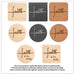 NOTE: Price is for a set of 4, 6, 8 or 12 coasters. Use options on the right (Below on Cell Phone) to select shape (Square or Circle), type (Wood, Stone or Cork) and add names. If no names just leave blank. See 3rd image for styles.